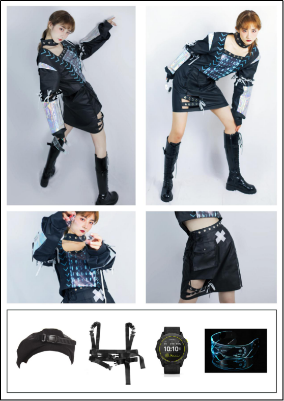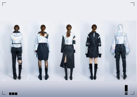 在成衣设计中,整体造型富有前卫的重工之感,使用大量金属拉链和立体口袋塑造空间感,分割连接内与外,平衡比例与线条,丰富层次和搭配,融入时装性裁剪的概念,打破传统的细节设计,主张创意表现和文化的融合,结合当下流行的都市机能风潮,在设计和功能上符合人体工程学,在各种环境的需求下既保证实用性也展现赛博风格独特的美学魅力。