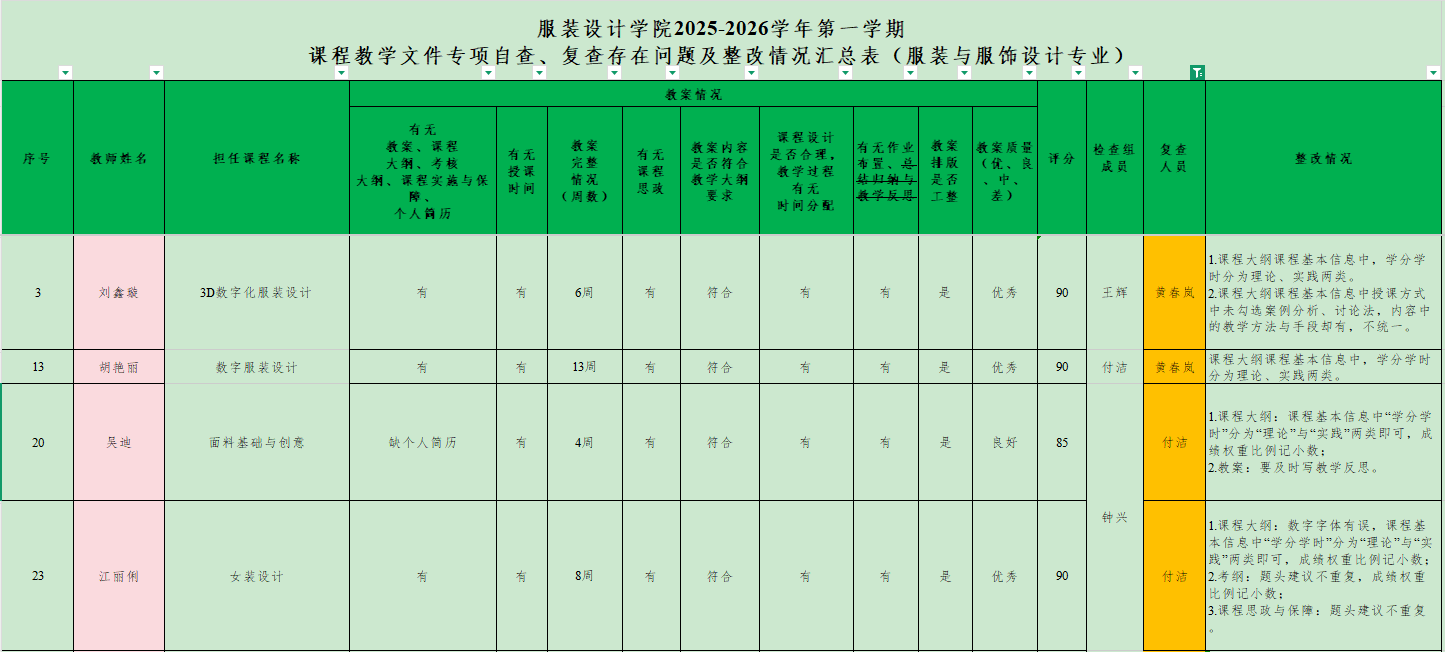 学院将以此次检查为契机,进一步规范教学管理、提升教学质量,为培养高素质服装设计人才筑牢根基。本次课程教学文件检查,充分体现了学院对教学质量的高度重视与严格要求。通过系统性检查评估,既有效规范了教学管理流程,又为教师专业能力提升和学科内涵建设提供了有力支持,彰显了学院持续推进教学改革、不断提高育人质量的坚定决心。后续学院将建立长效督导机制,重点关注各项整改措施的落实情况,确保检查工作取得实效,切实推动学院整体教学质量再上新台阶。