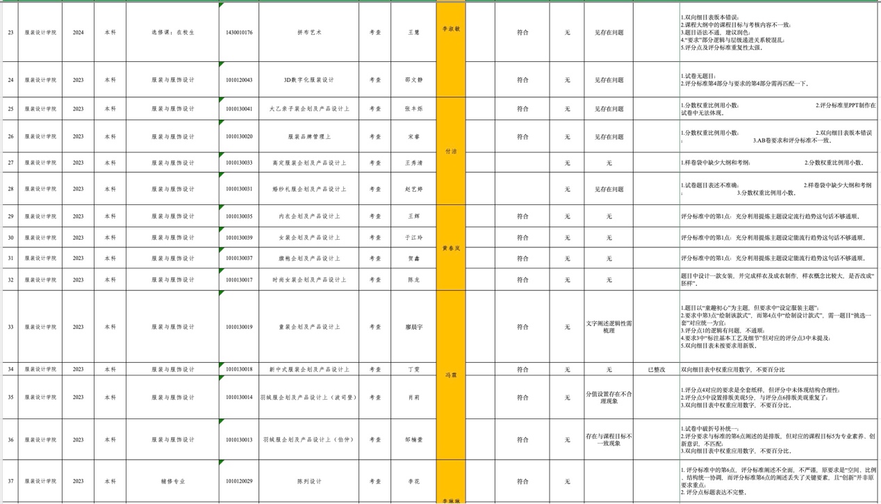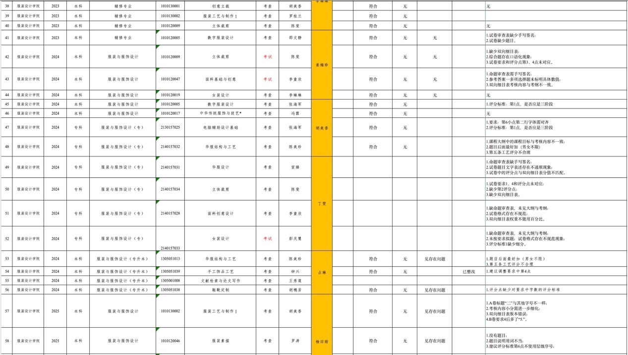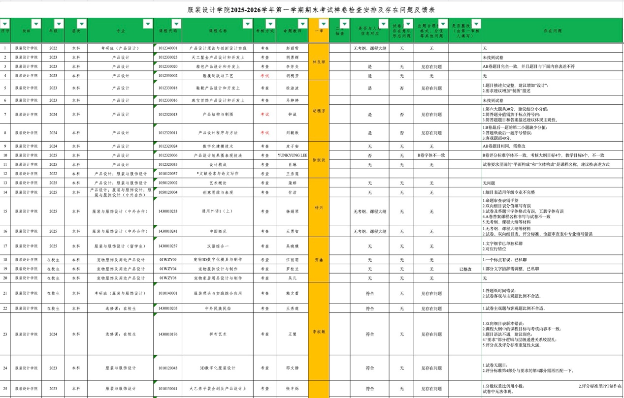 学院组成专项检查工作小组,由教研室主任贺鑫、钟兴、徐淑波,院督导李淑敏、付洁、黄春岚、冯霖及骨干教师李琳琳、丁雯、姜梅珍、胡美番、占琳、杨田甜、胡穗芳、林良琼15人一审,对服装与服饰设计专业48课程、产品设计专业 14 门课程,其中3门课程样卷2个专业共用,共59门课程样卷进行检查。
