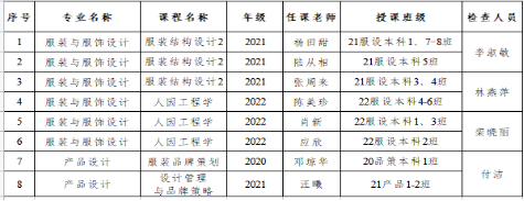 本次课程教学文件自查参照《江西服装学院课程教学大纲质量标准》、《江西服装学院教案质量标准》,发现了教学文件中的一些具体问题,督导组及时一一做了反馈并要求限期整改。在后续的教学过程中将追踪整改落实情况,坚持不断延伸监督触角,确保教学有序开展。