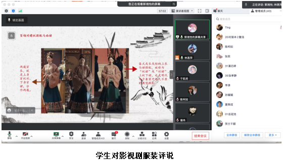 2.对分课堂教学法。为了让学生自觉、主动学习知识,也避免线上课堂空间问题。林燕萍教授会给学生布置一些互动内容:如讲到明朝服饰时,让学生对近年服化道制作较精良的影视剧服装进行评说,最后再评价及总结,让学生完全参与到教学环境中主动学习。许多学生开始只是按照PPT的内容进行朗读,经过训练,学生也能加入一些自己的观点,听讲的学生也会进行讨论。