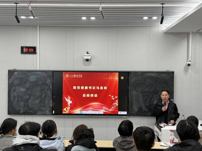 大会最后,学院党委副书记马忠秋作总结讲话。他首先对胡康老师的精彩解读表示感谢,并充分肯定了同学们心怀家国、勇担使命的热情。马忠秋巧妙结合学院专业特色,以“设计”喻人生,寄语在场同学:“军营,是你们进行最高层次‘青春设计’的广阔舞台;是从‘设计线’到‘冲锋线’的壮丽征程,更是淬炼成才、让‘迷彩绿’成为人生最‘燃’底色的特殊熔炉。”他勉励同学们将个人理想融入强国强军的伟大事业,用智慧和汗水为国防事业这块最厚重的“面料”剪裁出属于服装设计学子的独特风采,让青春在军营的历练中绽放出最绚丽的光芒。