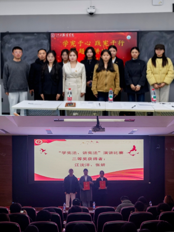 紧扣实践育人导向,分会成功举办学院“讲宪法大赛”,为学子搭建以赛促学的优质交流平台,通过层层严格选拔,最终推选江沈洋、方然两名优秀选手进入校赛。校级“学宪法讲宪法”演讲比赛中,两位选手凭借扎实的法律知识储备与深刻的法治内涵解读,分别摘得二等奖、优秀奖,充分展现出学院学子优良的法治素养与精神风貌。另外,学院因在普法各项工作中表现亮眼,获评校级“普法工作先进集体”荣誉称号。