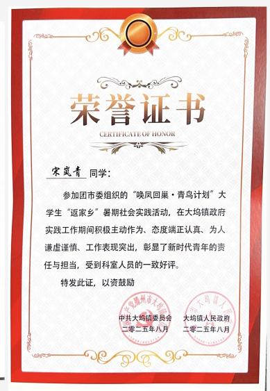 实践结束后,宋岚青获得了中共大坞镇委员会、大坞镇人民政府颁发的荣誉证书,证书中对她“积极主动作为、态度端正认真、为人谦虚谨慎、工作表现突出”的评价,是对她这段实践经历的最佳肯定。但这份认可并未让她停下脚步,反而更加坚定了她的信念。未来,她将继续带着这份对家乡的热爱,把在“三下乡”实践中收获的成长与感悟融入专业学习,用服装设计的专业所长为家乡文旅产业发展出谋划策,用青春力量为家乡振兴添砖加瓦。