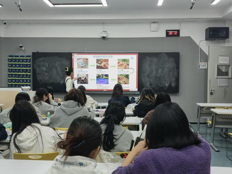 活动伊始,社团指导老师王袭聚焦非遗技艺“螺钿”展开专题讲解。老师从螺钿的历史渊源、工艺特点、材料选择等方面娓娓道来,通过实物展示与案例分析,详细拆解螺钿镶嵌的核心技法,让同学们直观了解这一古老工艺的精妙之处。同时,老师强调非遗文化的当代价值,鼓励同学们将螺钿、盘扣等非遗元素融入服装设计、产品设计等专业创作中,用现代设计语言赋予传统文化新的生命力。