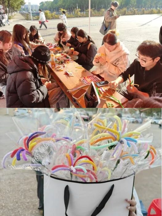 另一边的扭扭棒DIY区域同样热火朝天,彩色扭扭棒、小彩灯、装饰配件摆满长桌,同学们跟着教程弯折、拼接,将普通的扭扭棒变成一朵朵“永不凋谢的烟花”。指尖翻飞间,一根根扭扭棒幻化成绽放的烟花造型,点亮了冬日校园,成品被同学们捧在手中,成了独一份的新年浪漫。
