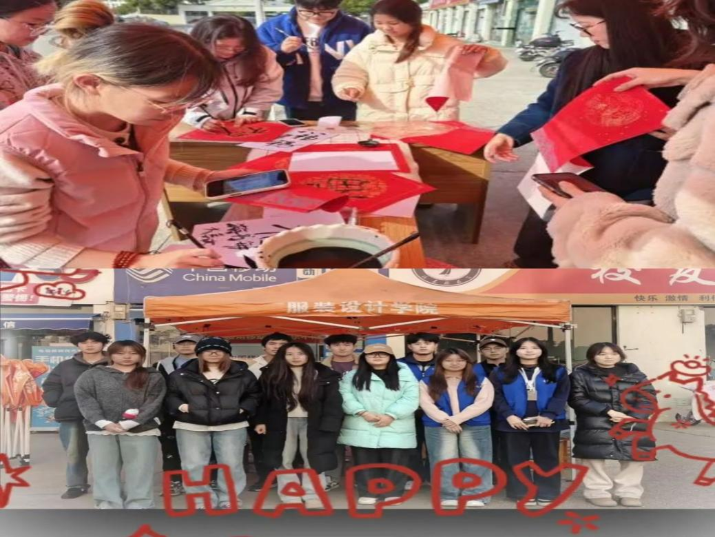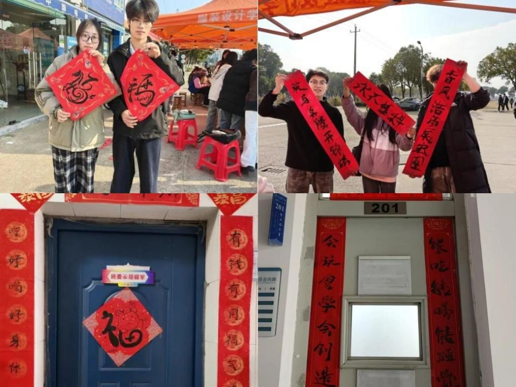 红纸铺展,墨香四溢,写春联、绘福字的区域成了活动现场的“人气C位”。不管是书法功底深厚的“大神”,还是初次执笔的新手,都握着毛笔尽情挥洒创意。“吃好喝好身体棒”“有钱有闲福气旺”,俏皮又接地气的春联词句跃然纸上;生肖元素、服装纹样融入福字绘制,让传统福字多了服院学子的专属设计感。写完的春联和福字被大家小心翼翼收好,准备带回宿舍装点出满满的新年氛围。