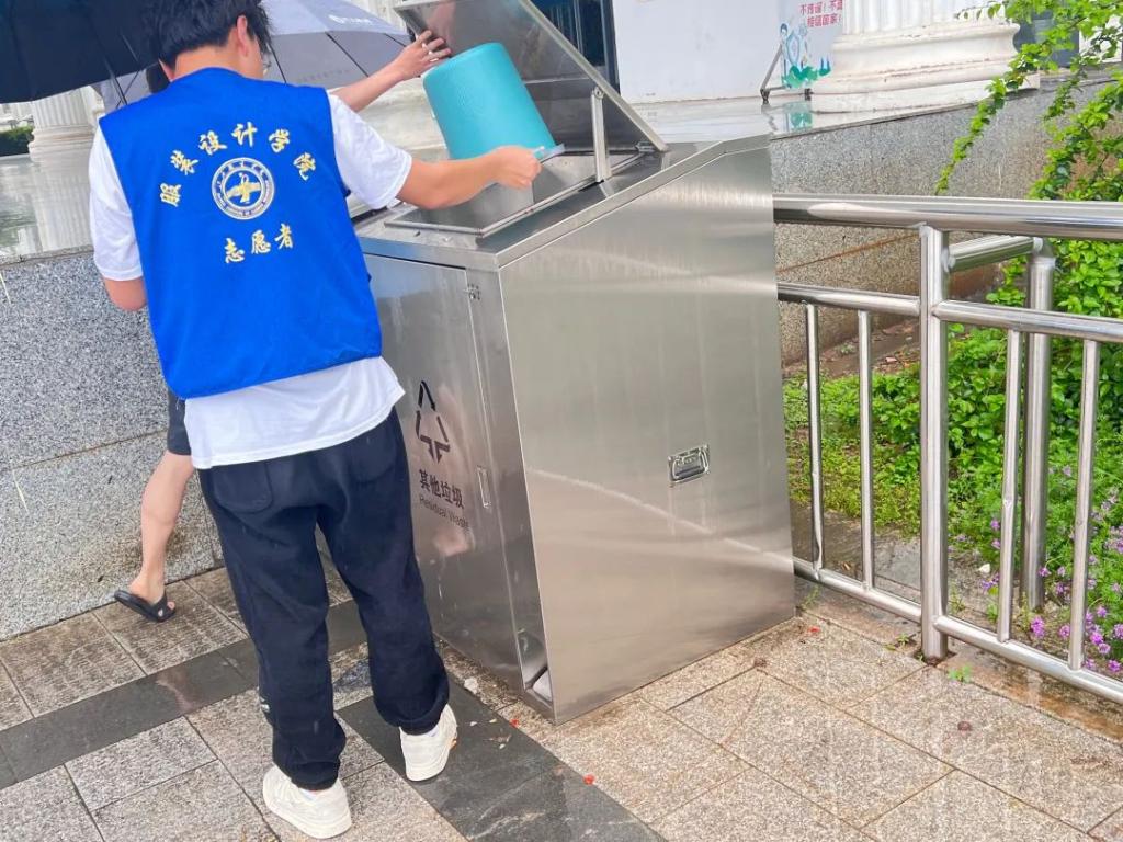 天气恶劣,下着雨,即便如此同学们依旧带着清洁工具来到主教楼集合,教室内的同学有条不紊地收拾整理桌椅,清扫着教室内地上的垃圾及桌上的残渣,扫地拖地样样不落,他们分工明确,各负其责,很快就将教室打扫得干干净净,一尘不染。在室外的同学团结一心,同学之间相互撑着伞在雨里打扫浸满雨水的垃圾,将垃圾倒进垃圾桶。经过同学们辛勤劳动进一步将校园打扫得整洁明亮。活动结束后,焕然一新的校园环境,让每个人的脸上都洋溢出心满意足的笑容。
