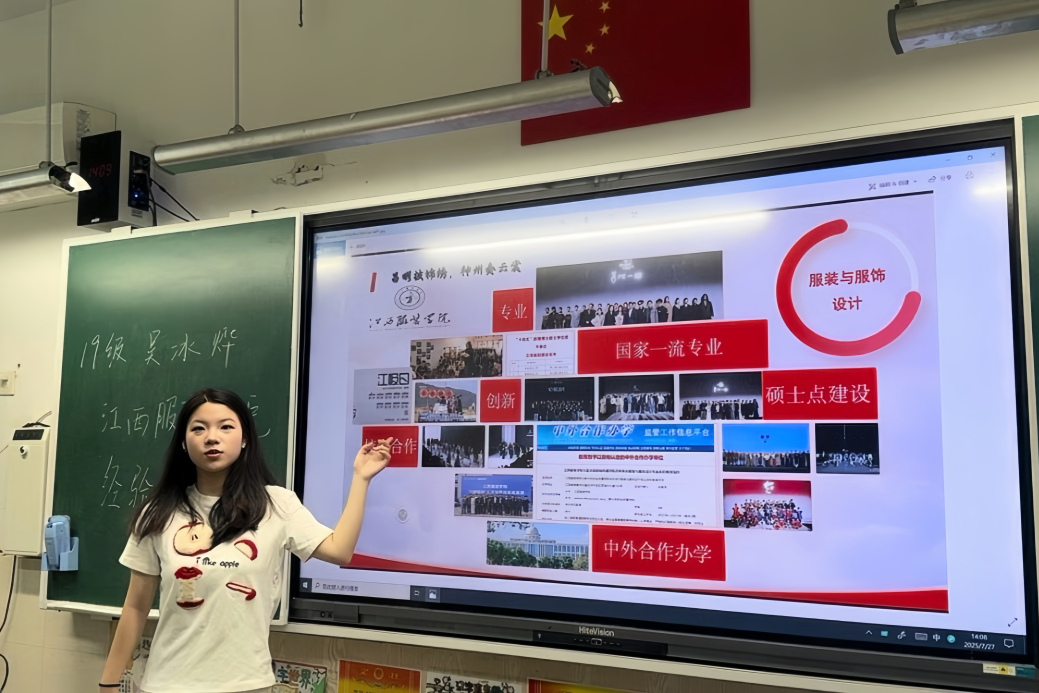 在阔别的高中母校长兴县华盛高级中学,吴冰烨不再仅仅是以学姐的身份,更是一位政策“引路人”。她提前联系了高中的班主任,精心准备了一场别开生面的宣讲会。作为艺术班,她结合自己艺术生的身份,将自身在大学服装设计专业的学习、生活经历与国家资助政策紧密结合,开展了关于国家对学生资助政策的宣讲。面对台下对未来充满憧憬又略带忐忑的艺术类学弟学妹,她分享了如何利用国家奖学金、国家励志奖学金激励学业进步,如何通过国家助学金缓解生活压力,详细拆解了国家助学贷款如何覆盖这些成本、学费减免和“绿色通道”政策如何确保困难新生“无障碍”入学,让每一个困难学生了解学生资助的条件,让每一个学生不因家庭困难而辍学。真实的经历、专业的解读,让抽象的政策变得触手可及,现场互动踊跃,许多学生的眼神中重新燃起了坚定追梦的光芒。