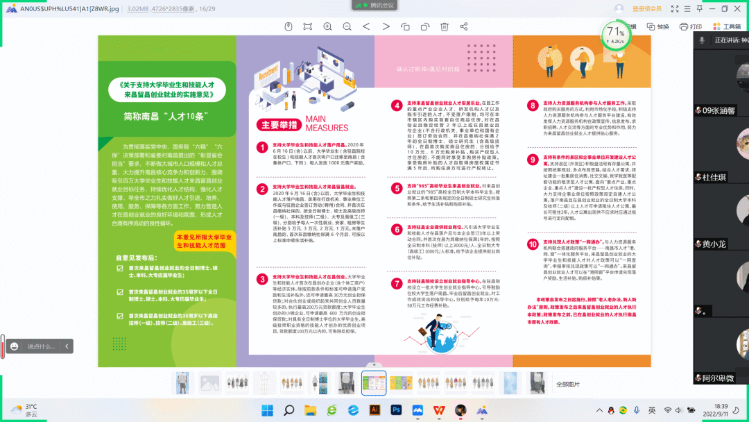为贯彻落实党中央、国务院“六稳”“六保”决策部署和省委对南昌提出的“彰显省会担当”要求,不断做大城市人口规模和人才总量,大力提升南昌核心竞争力和创新力,围绕吸引百万大学毕业生和技能人才来昌留昌创业就业目标任务,持续优化人才结构,强化人才支撑,举全市之力扎实做好人才引进、培养、使用、服务、保障等各个方面工作,努力营造人才在昌创业就业的良好环境和氛围,形成人才合理有序流动的良性循环。南昌市出台《关于支持大学毕业生和技能人才来昌留昌创业就业的实施意见》,主要以落户有奖励、就业有补贴、创业有扶持、购房有实惠、岗位有保障等方面为着力点,提出了具体举措和量化指标。2022年9月11日晚19时,我院2022级、2023届各班班主任在主题班会上进行了《关于支持大学毕业生和技能人才来昌留昌创业就业的实施意见》宣讲。