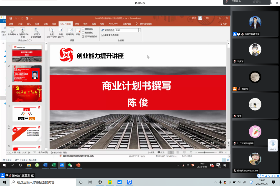 培训会上,陈俊老师详细介绍了一份优秀的商业计划书,需从夺人眼球的封面目录、到楼层钢筋骨架的“目录”、详细明了的计划摘要、再到阐述自身创业团队的管理者,产品,销售计划的不同之处都做了详细的讲解。并从市场分析、产品服务、商业模式、财务融资、团队介绍、社会价值等六个模块逐一进行了对商业计划书的赋能。