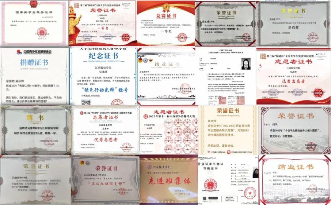 她始终牢记学习是学生的第一要务,秉持严谨的学风和开放革新的思维,刻苦钻研专业知识,拓宽知识面,连续两年保持班级成绩第一。为提升专业实践能力,她多次主动前往服装企业实习,参与企业内部服装设计工作,在赫利童装产业学院表现优异,荣获江西省纺织服装现代产业学院优秀学员奖。同时,她注重综合素质提升,考取普通话二甲证书、国际日本语能力N3证书,在课外竞赛中斩获多项国家级、校级奖项,以勤奋与坚持在专业道路上稳步前行。
