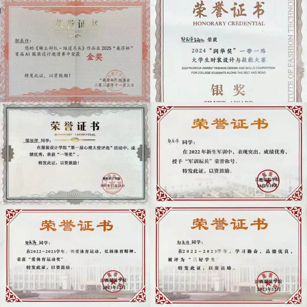 在校期间,他始终秉持“以赛促学、以赛促练”的理念,积极投身各类高规格专业赛事。在2024年“润华奖”一带一路国际大学生时装设计与技能大赛中,他凭借扎实过硬的专业功底崭露头角,勇夺银奖。这份亮眼佳绩的背后,是无数个伏案构思的深夜、一遍遍推翻重来的设计稿、对每一处线条与版型的精雕细琢,更是他对服装设计这门学科的极致执着与坚守。