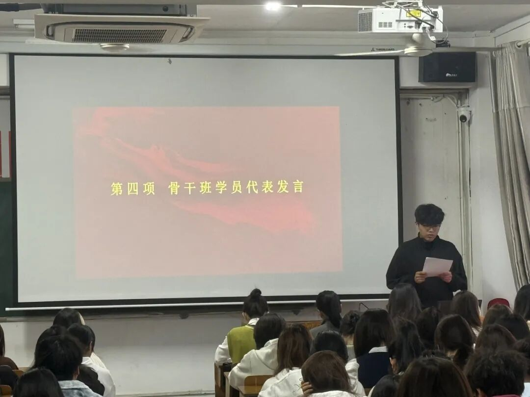 随后,骨干班学员代表在仪式上发言。学员表达了对学院领导和老师的感谢,他表示,作为“青马工程”学员,深感责任重大、使命光荣。她承诺,全体学员将严格遵守培训纪律,认真完成各项学习任务,积极参与实践活动,在培训中不断磨砺自己,努力提升自己的综合素质。