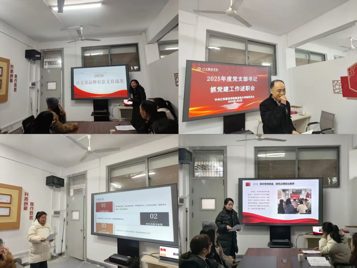 会上,各党支部书记围绕2025年度思想政治建设、党支部标准化规范化建设、“双创”工作特色、“三会一课”与主题党日、党员教育与管理、党建与教学科研及学生培养等中心工作的融合成效、党风廉政建设等方面进行全面汇报,系统梳理了工作中的亮点特色,深刻剖析了存在的问题与不足,并结合支部实际明确了2026年度的改进方向与工作规划。