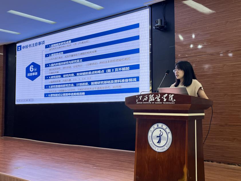 艺术设计学院戴沂君博士围绕课题申报的完整流程,系统梳理了三大关键环节。她首先强调“选题来源”是研究的根基,提醒教师需注重从实际教学与行业前沿中发掘真问题。在“申报书撰写”部分,她结合案例详细说明了许多注意事项,包括认真阅读填报说明、严格遵循格式规范、重视文献综述与权威引用、精准提炼研究目标与重点难点,并合理设计研究思路与方法。