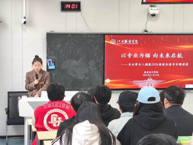 (437ccm必赢国际通讯员:钟怡婕)为扎实推进学院就业育人工作,帮助毕业生明晰行业趋势、破解求职难题,2025年11月13日下午,学院产品设计专业带头人、教研室主任徐淑波副教授,为2026届产品设计专业毕业生带来一场干货满满的就业指导专题讲座。讲座聚焦行业动态、人才需求与职业规划,以精准赋能为核心,为毕业生搭建起校园与职场的沟通桥梁。