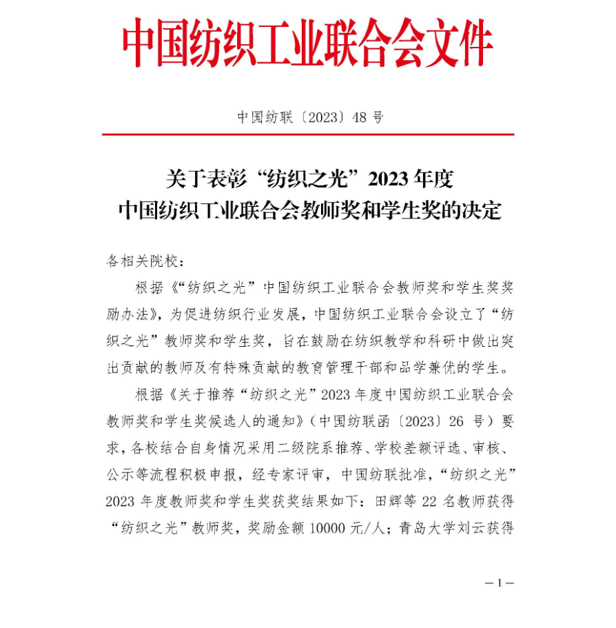 据悉,“纺织之光”教师奖和学生奖是中国纺织工业联合会为实施科教兴纺战略,促进纺织行业发展,通过所属的纺织之光科技教育基金会出资设立的奖项,用以鼓励在纺织教学和科研中作出突出贡献的教师及有特殊贡献的教育管理干部和品学兼优学生。基金会每年在全国16所纺织服装院校评选“纺织之光”教师奖23名、学生奖154名。