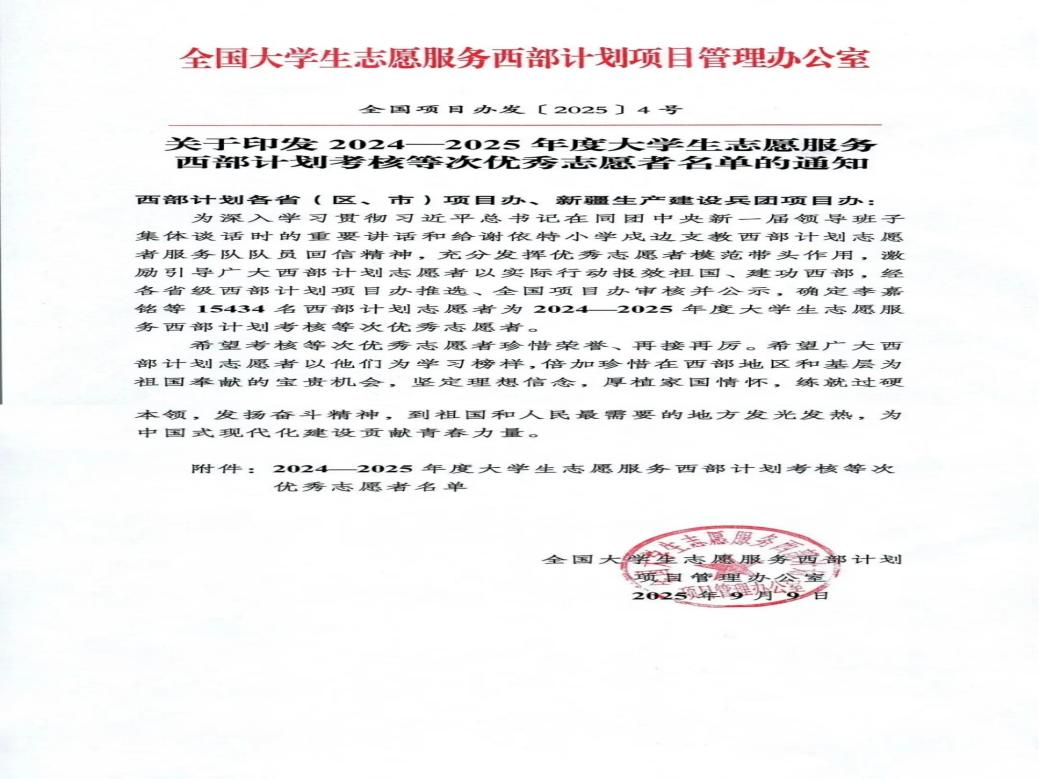 (437ccm必赢国际通讯员:张芳)欣悉我院2024届毕业生吴欣怡同学,在参加大学生志愿服务西部计划期间,信念坚定、担当实干,在四川省甘孜藏族自治州巴塘县莫多乡人民政府乡村社会治理岗位上表现卓越,荣获2024—2025年度全国大学生志愿服务西部计划“优秀志愿者”称号,特向全体师生报喜!