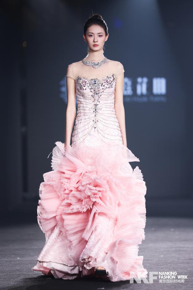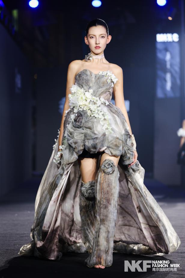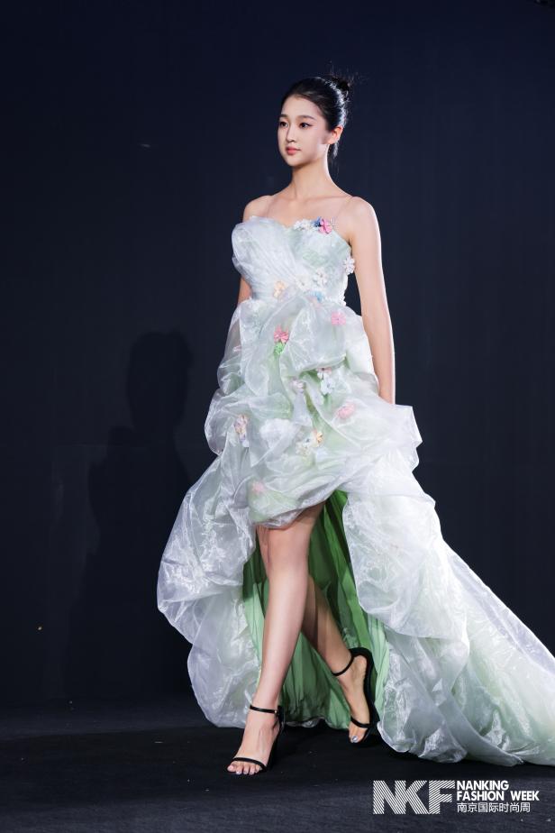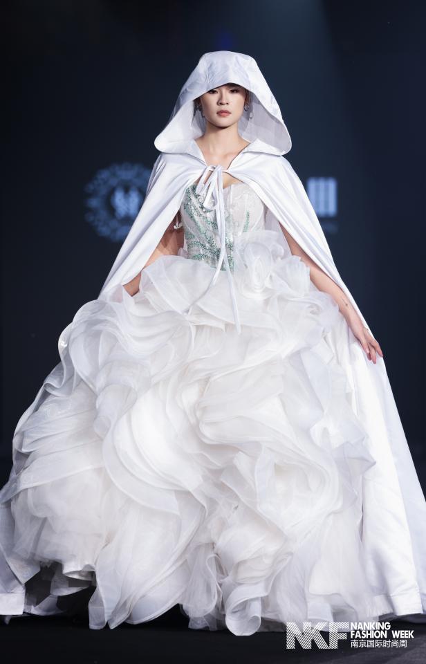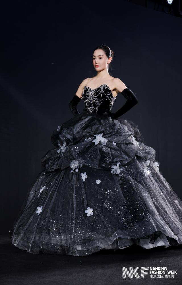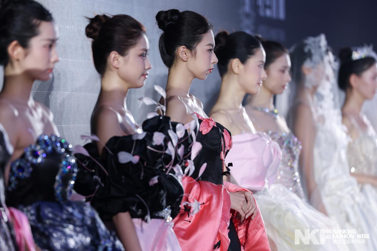 整场发布以“流光花语”为主题,通过光影与花卉的诗意交织,诠释婚纱作为情感载体的艺术表达。青绿与粉红勾勒春日的柔美,黑白对比传递庄重与永恒,缎面与轻纱材质流动相映,金属装饰细节则凸显现代新娘的独立气质。发布会作品分为四大系列:第一系列晨曦花境,以拂晓花园为灵感,运用青黛、粉黛等朦胧色调,搭配立体花卉与层叠褶皱,轻盈廓形结合缎面内衬,演绎初绽花朵的清新与希望;第二系列繁花幻影,再现正午花园的绚烂,通过大面积白色渐变与黑色收束,结合面料拼贴与金属配饰,在缎面与轻纱的混合中营造丰盈花海的视觉张力。第三系列暮色绽放,聚焦暮色时分的神秘暖调,以粉与黑为主色,运用夸张褶皱与交错廓形,在厚缎与深色薄纱的对比中,以金属饰件点缀出自然与人造共生的浪漫叙事。第四系列永恒花誓,定格誓言永恒的瞬间,以黑色为主调局部点缀粉红与青绿,通过立体花卉与极简线条的对比、缎面大裙摆与多层轻纱的结合,彰显新娘坚定优雅的光芒。