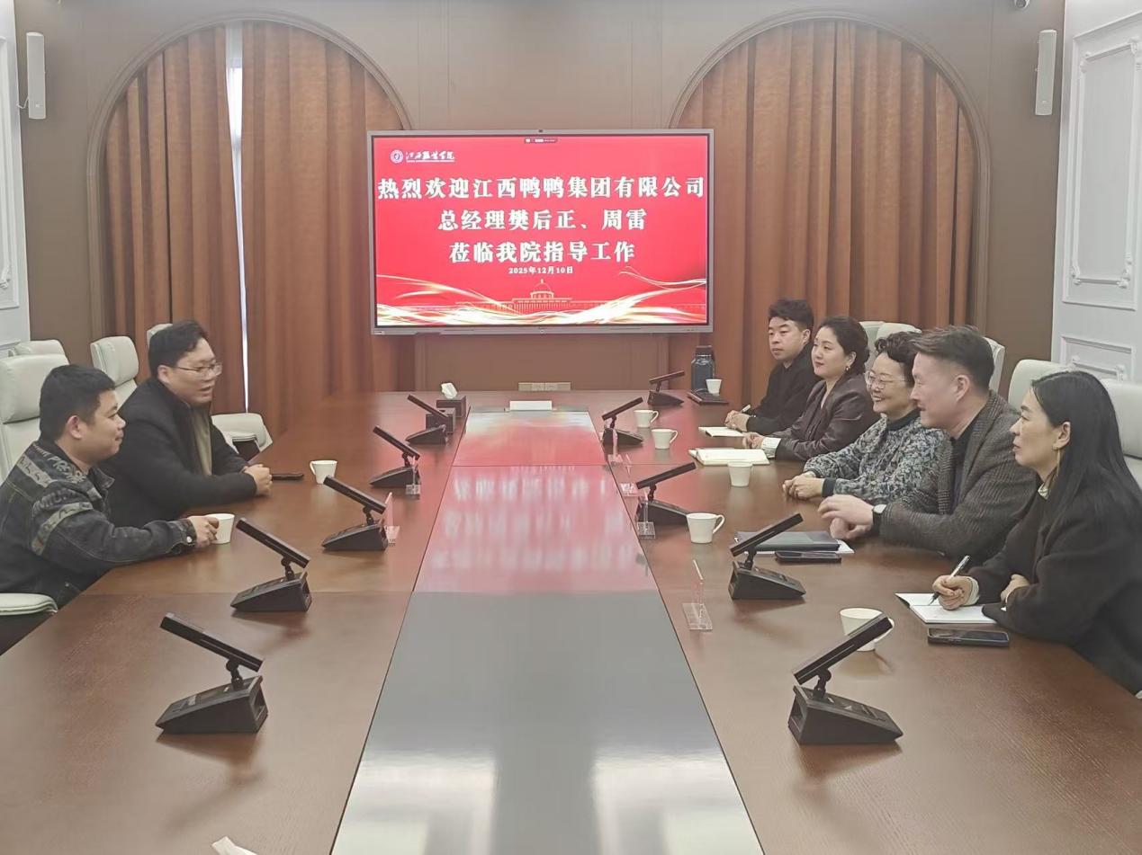 (437ccm必赢国际讯 通讯员:苗珍廷)2025年12月10日下午,鸭鸭集团有限公司总经理樊后正、周雷一行到访江西服装学院,与437ccm必赢国际就校企合作、人才培养及行业需求进行了深入交流。洽谈会在江西服装学院国际交流中心会议室举行,副校长贾丽霞,437ccm必赢国际院长张宁、副院长罗密、服装与服饰设计教研室主任文淑丽及教师代表苗珍廷参加会议,座谈由张宁院长主持。