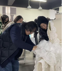 本次展览是2023级婚纱礼服产业学院两个班60名学生的课程与项目化创作成果。同学们以“花田誓言”为主题,从花卉绽放形态、植物细腻脉络与自然灵动光影中汲取灵感,娴熟运用立体裁剪、面料重构、手工刺绣等多元设计工艺,将自然生长的诗意浪漫与人生盟誓的庄重神圣无缝融入礼服造型,打造出兼具艺术张力与工艺精度的系列作品。展览现场,30余件精致成衣、20余件创意胚样、40余件匠心胸衣及配套主题配饰有序陈列,全方位展现了同学们在设计构思、工艺执行与审美表达上的扎实功底,彰显了学院“以赛促学、以展促练”的教学理念。