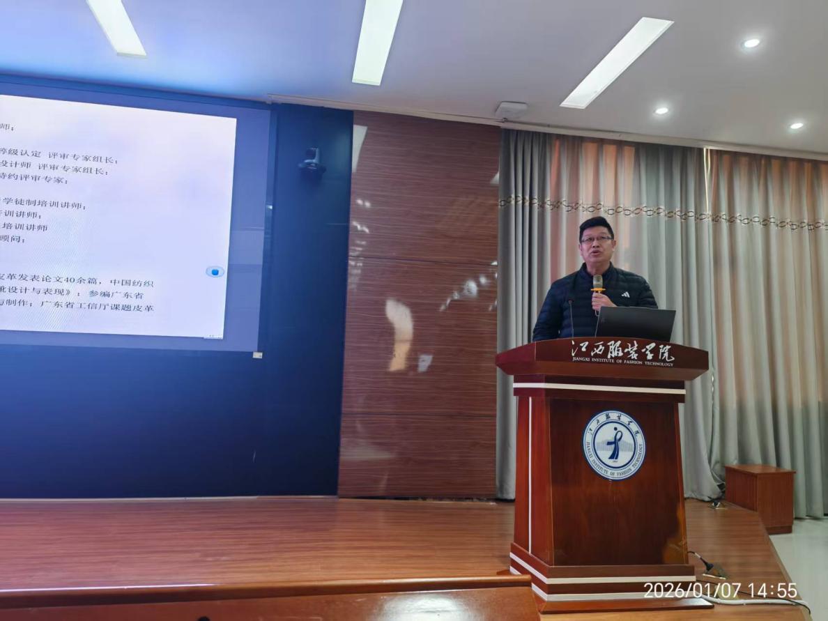 (437ccm必赢国际讯 通讯员:刘毓歆)2026年1月7日,受江西服装学院437ccm必赢国际诚挚邀请,广东鞋业厂商会执行会长、国家二级鞋类设计师张满丰,以及中国皮革协会培训专家、国家一级鞋类设计师伏邦国走进437ccm必赢国际,为产品设计专业2023级学生及专任教师带来了一场内容充实、紧密贴合产业实际的专题宣讲。讲座由437ccm必赢国际副院长陈晓玲主持。